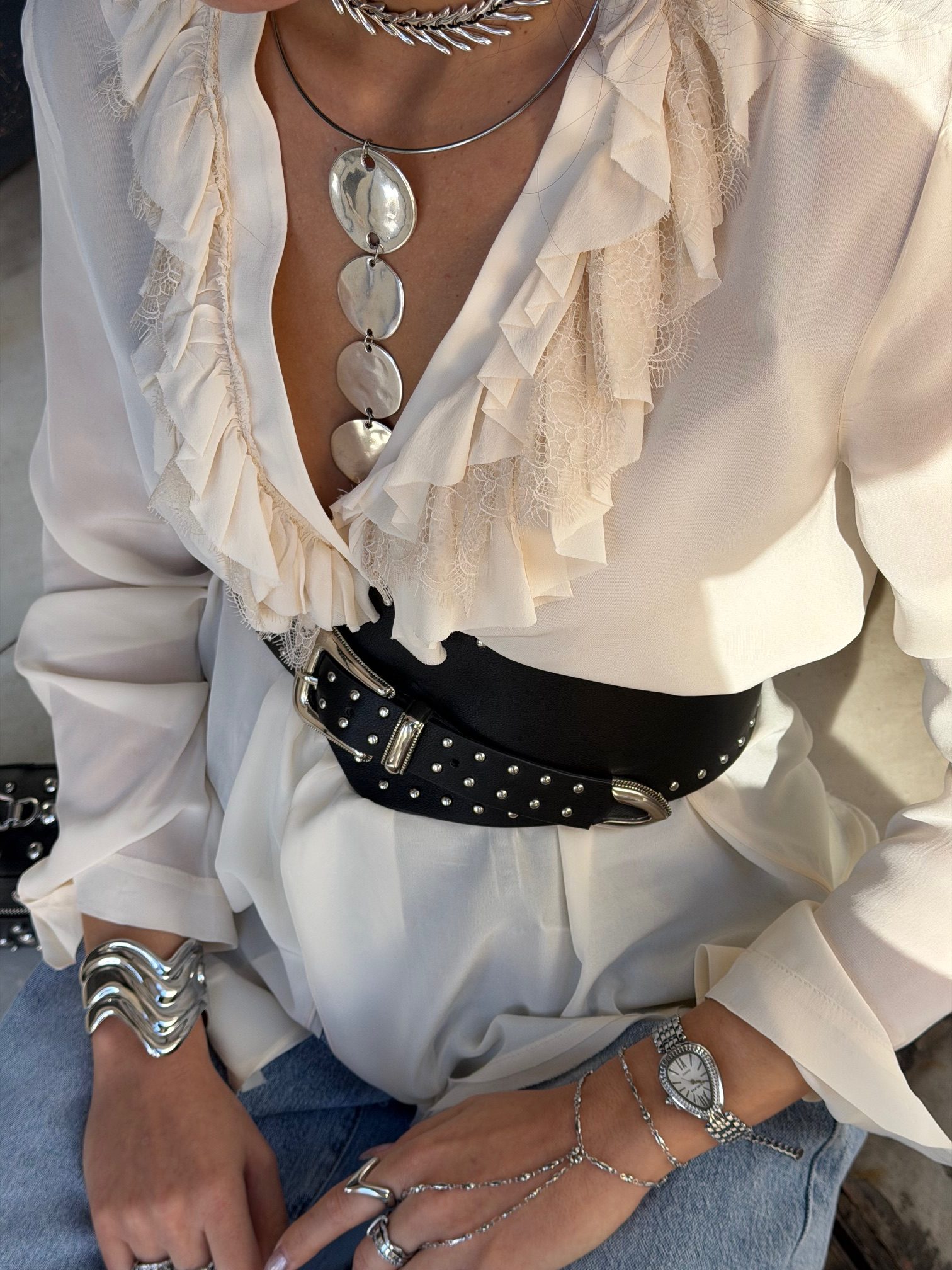 Μαύρη ζώνη από δερματίνη με μεταλλικά τρουκς και statement αγκράφα. Ιδανική για να τονίζει τη μέση και να ολοκληρώνει κάθε outfit, από casual μέχρι πιο fashion εμφανίσεις.