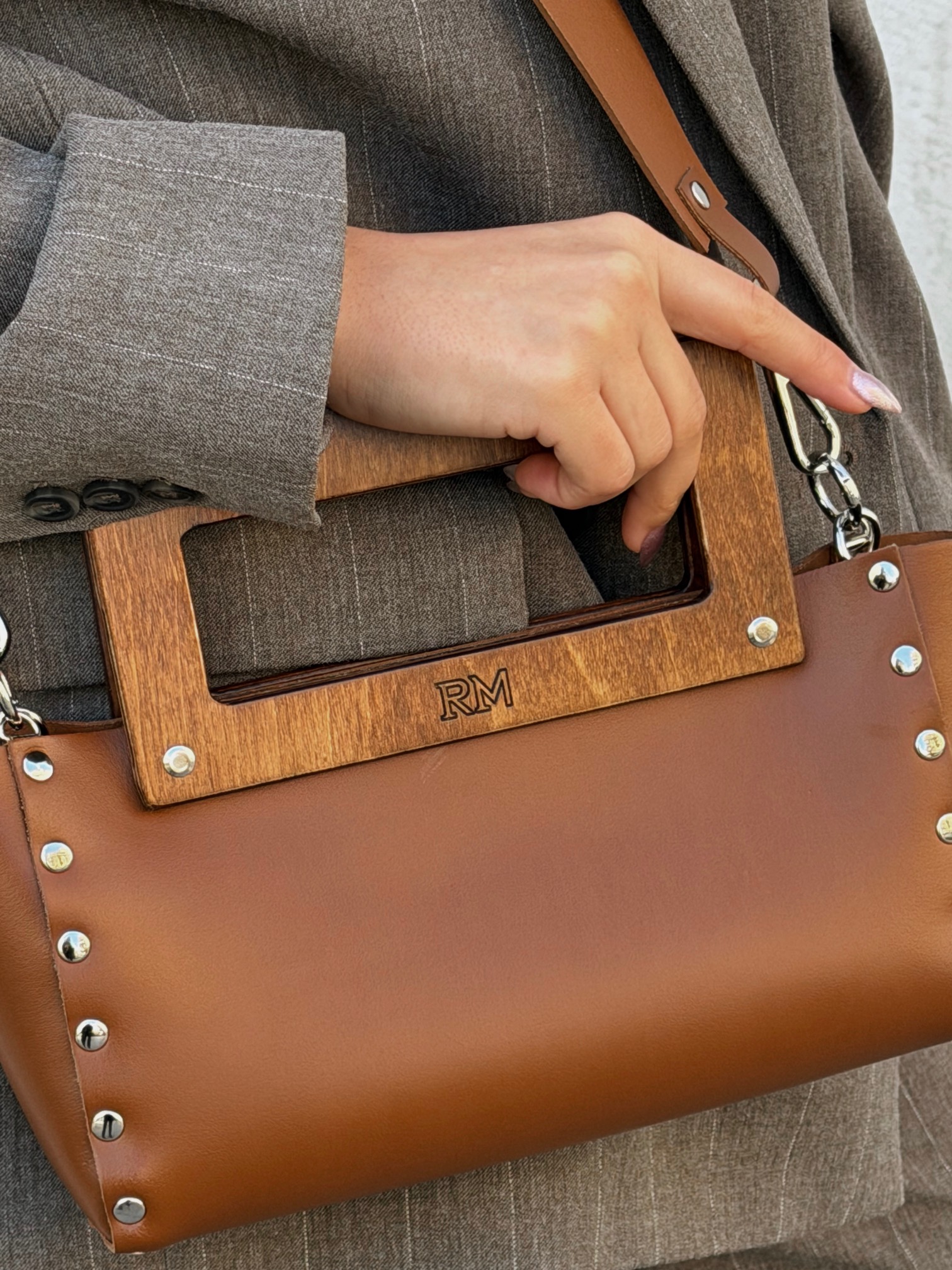 Τσάντα από γνήσιο δέρμα με χειροποίητο ξύλινο χερούλι και δύο αποσπώμενα λουράκια ώμου, ένα δερμάτινο και ένα αλυσίδα. Συνδυάζει φυσικά υλικά, λειτουργικότητα και σύγχρονο σχεδιασμό.