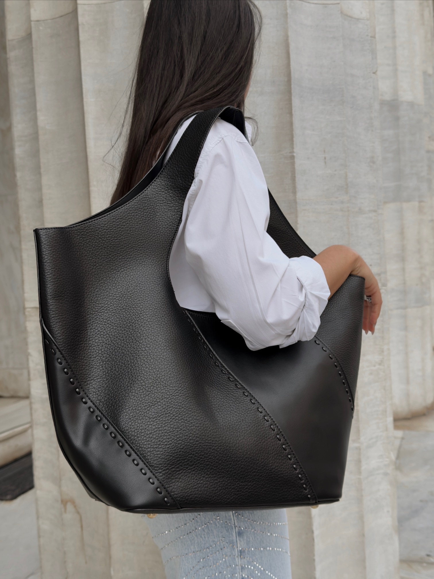 Μεγάλη μαύρη τσάντα από δερματίνη με minimal σχεδιασμό και πρακτικό επιπλέον νεσεσέρ. Ιδανική για καθημερινή χρήση, δουλειά ή ταξίδια.