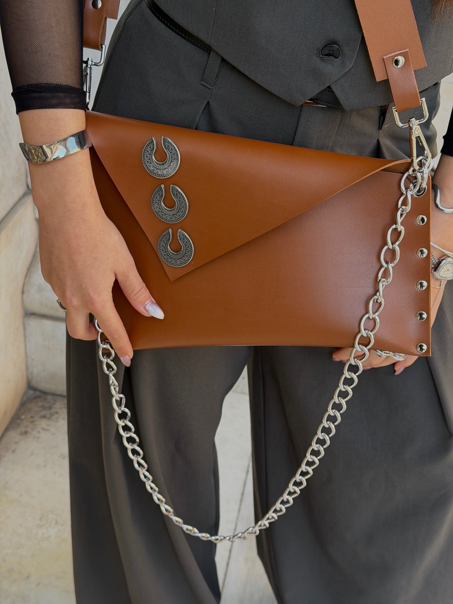Δερμάτινη τσάντα με διακοσμητικά μεταλλικά στοιχεία και δύο λουράκια, ένα αλυσίδα και ένα δερμάτινο. Σχεδιασμός που συνδυάζει δυναμικό χαρακτήρα και πρακτικότητα για καθημερινή χρήση.