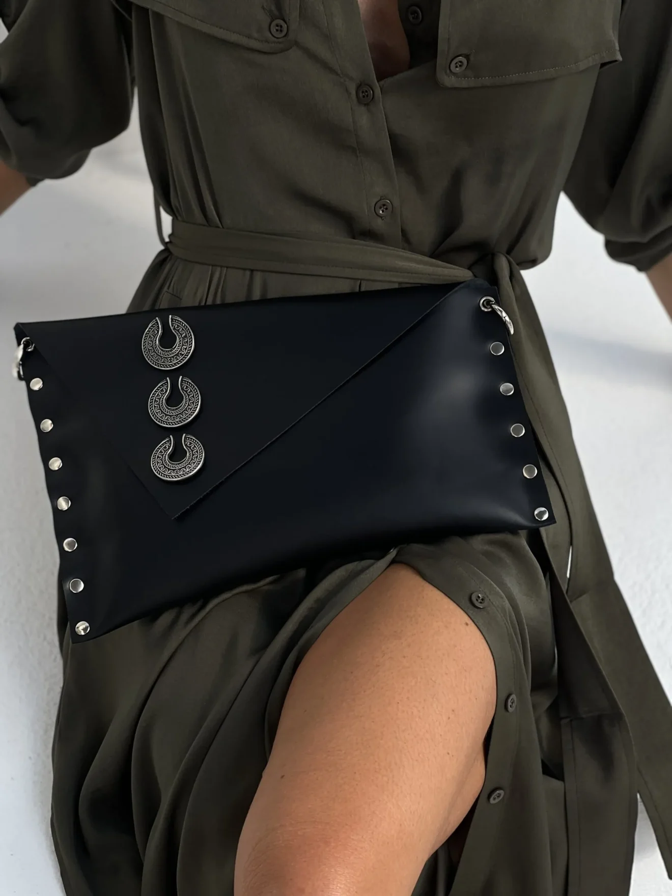 Χειροποίητη δερμάτινη τσάντα με διακοσμητικά μεταλλικά στοιχεία και δύο λουράκια, ένα αλυσίδα και ένα δερμάτινο. Σχεδιασμός που συνδυάζει δυναμικό χαρακτήρα και πρακτικότητα για καθημερινή χρήση.
