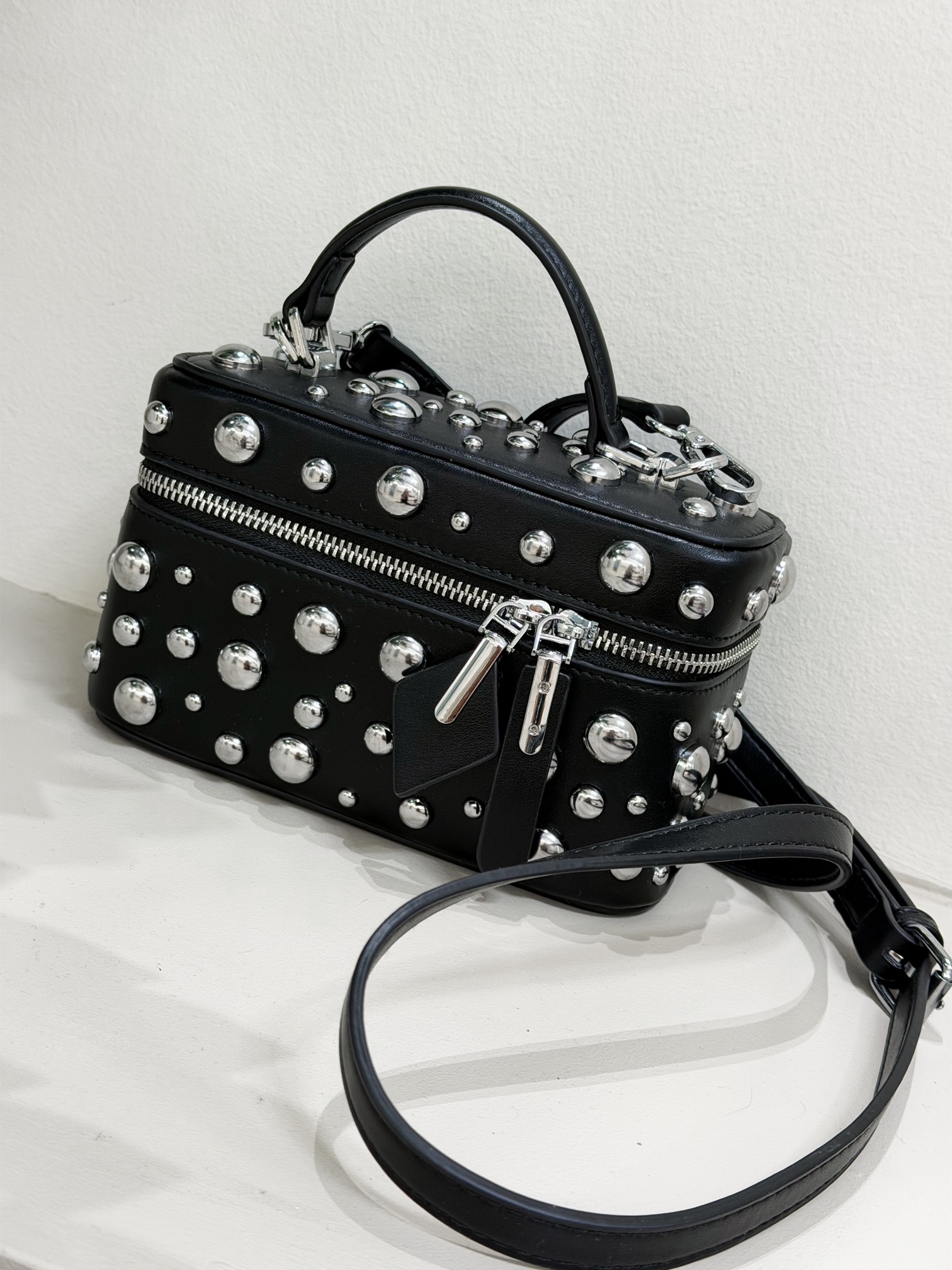 Τσάντα χειρός από δερματίνη με μεταλλικά τρουκς που προσθέτουν μοντέρνο χαρακτήρα. Διαθέτει αποσπώμενο λουράκι για χρήση και στον ώμο, ιδανική για καθημερινές αλλά και βραδινές εμφανίσεις.