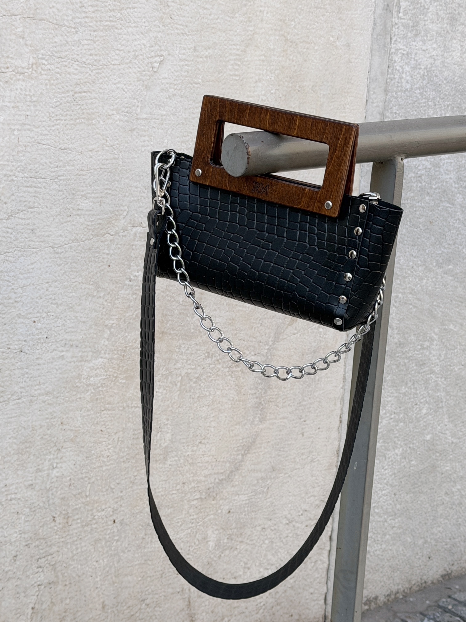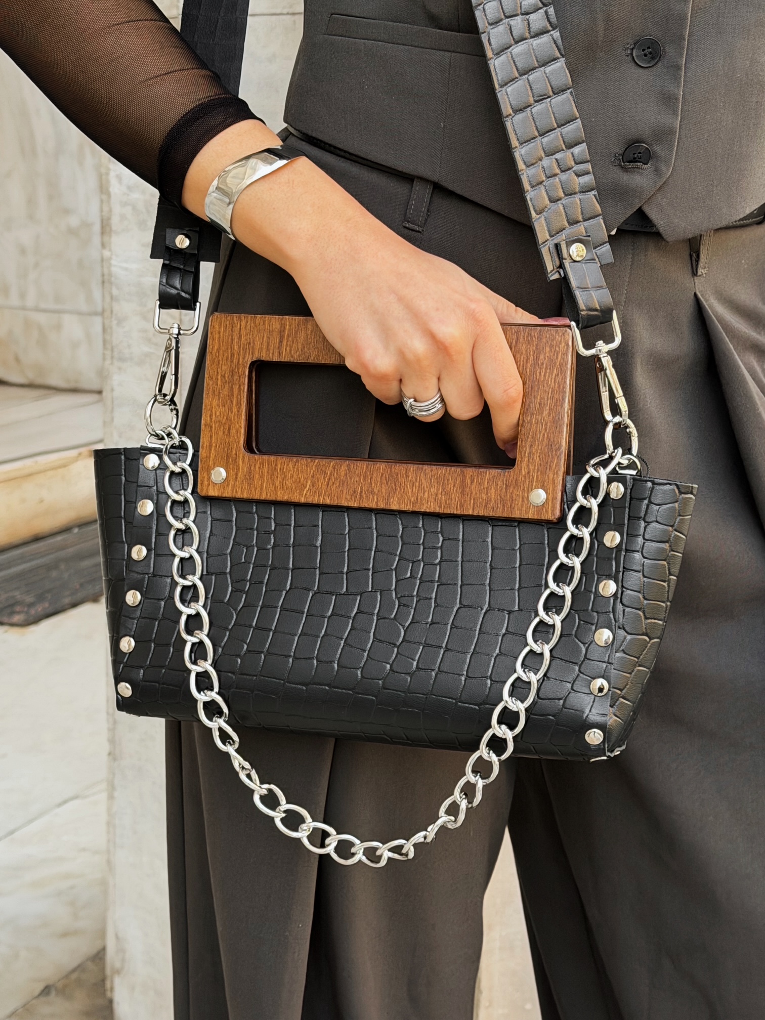 Δερμάτινη τσάντα από γνήσιο δέρμα με ιδιαίτερο ξύλινο χερούλι και αποσπώμενο λουράκι ώμου με αλυσίδα. Ένα statement κομμάτι που συνδυάζει φυσικά υλικά και σύγχρονο σχεδιασμό.
