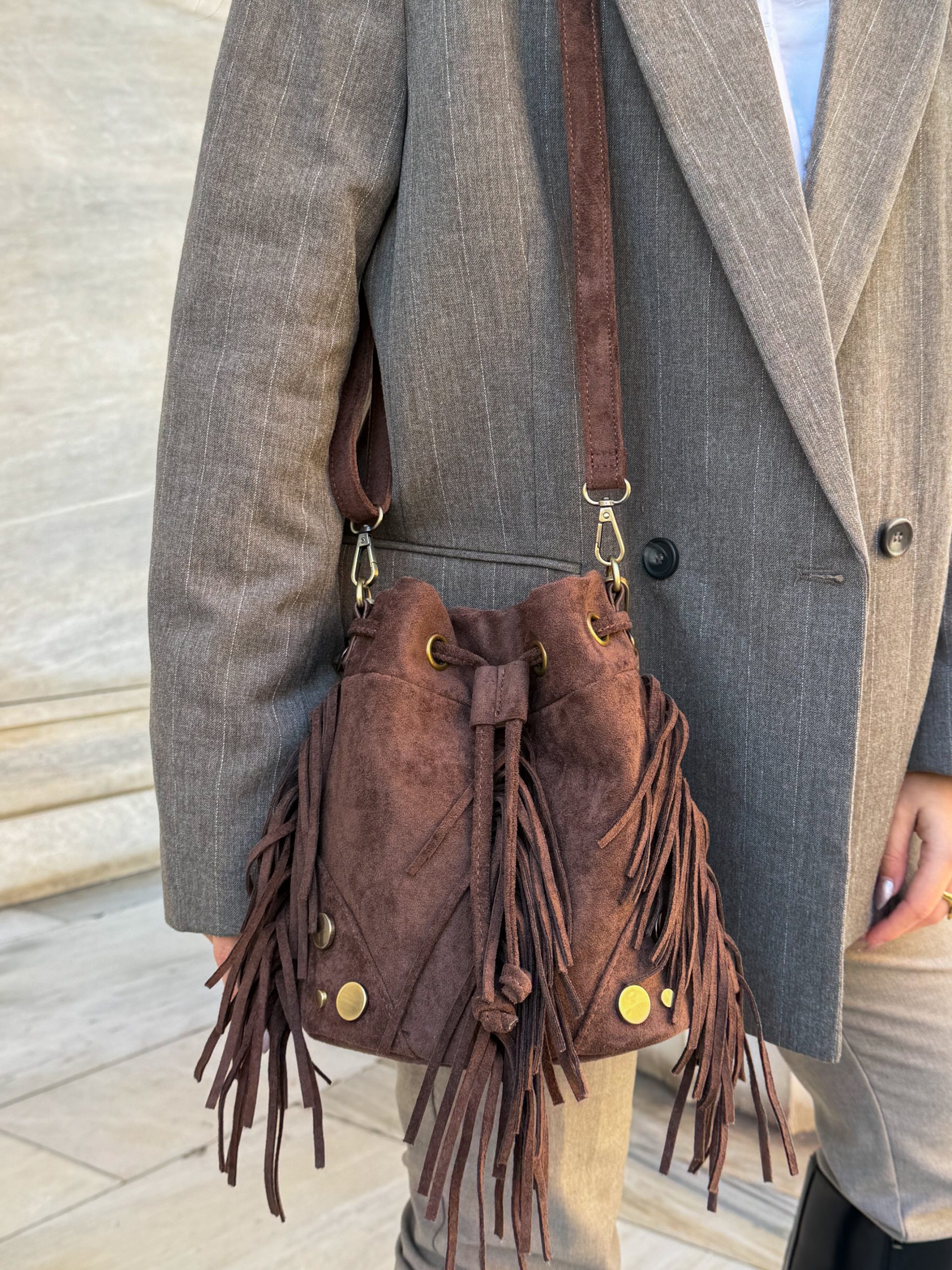 Τσάντα πουγκί από δερματίνη με κρόσσια και τρούκς, με δύο λουράκια για ώμο ή χιαστί. Boho statement επιλογή για καθημερινές εμφανίσεις.